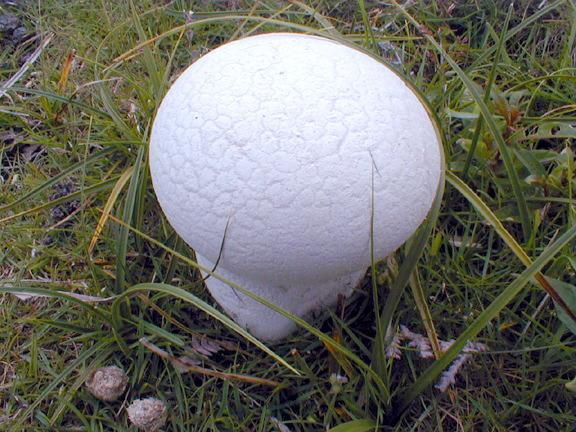 Round white fungi that can grow as large as a football, darkening and shrivelling as they age