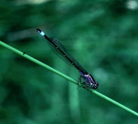 One of Britain's commonest damselflies, usually dark with a blue tail