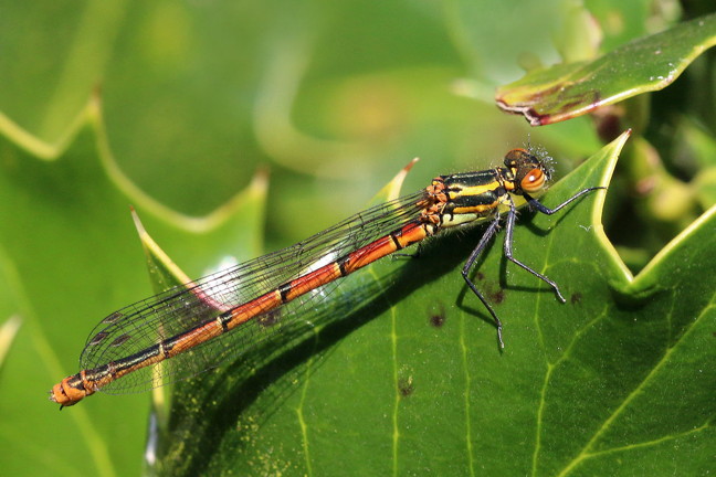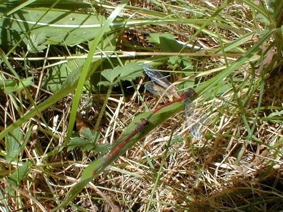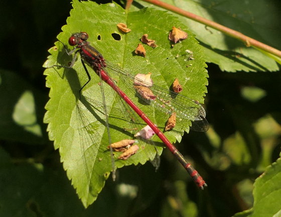Distinctive red-and-black damselfly, often the first to be seen in spring