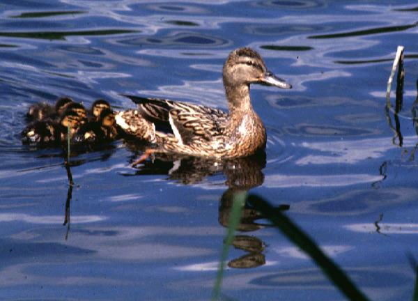 Male has bottle green head and grey body, yellow bill, black rear end; female mottled brown with orangey bill; 60 cm