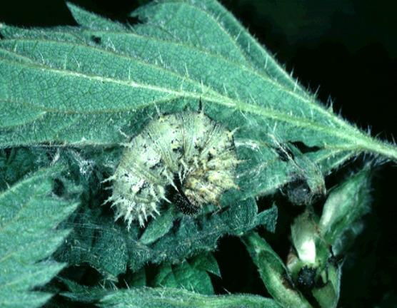 Eggs, pale green at first but darkening, are laid singly on stinging nettles and occasionally on hop plants